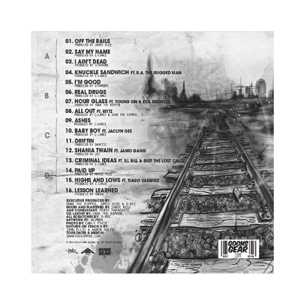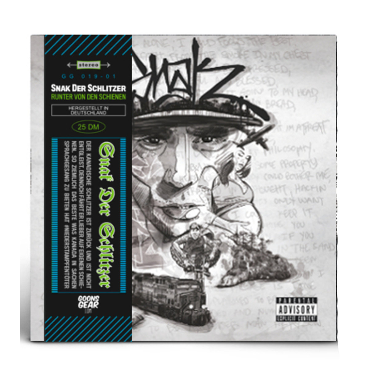 Snak The Ripper - "Off The Rails" Black Double Vinyl comes in a dope Gatefold Cover. This is the first ever Vinyl release by Snak The Ripper exclusive at GoonsGear, limited to 300 Units (150 classic Black & 150 solid Blue). Every Unit is hand-numbered and comes with Stickers.